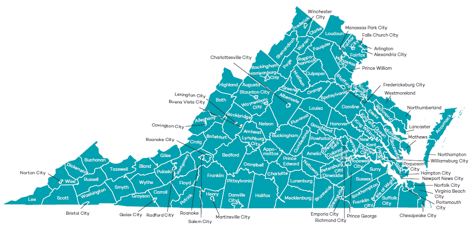 Accomack, Albemarle, Alexandria City, Alleghany, Amelia, Amherst, Appomattox, Arlington, Augusta, Bath, Bedford, Bland, Botetourt, Bristol City, Brunswick, Buchanan, Buckingham, Buena Vista City, Campbell, Caroline, Carroll, Charles City, Charlotte, Charlottesville City, Chesapeake City, Chesterfield, Clarke, Colonial Heights City, Covington City, Craig, Culpeper, Cumberland, Danville City, Dickenson, Dinwiddie, Emporia City, Essex, Fairfax City, Fairfax, Falls Church City, Fauquier, Floyd, Fluvanna, Franklin City, Franklin, Frederick, Fredericksburg City, Galax City, Giles, Gloucester, Goochland, Grayson, Greene, Greensville, Halifax, Hampton City, Hanover, Harrisonburg City, Henrico, Henry, Highland, Hopewell City, Isle of Wight, James City, King and Queen, King George, King William, Lancaster, Lee, Lexington City, Loudoun, Louisa, Lunenburg, Lynchburg City, Madison, Martinsville City, Manassas City, Manassas Park City, Mathews, Mecklenburg, Middlesex, Montgomery, Nelson, New Kent, Newport News City, Norfolk City, Northampton, Northumberland, Norton City, Nottoway, Orange, Page, Patrick, Petersburg City, Pittsylvania, Portsmouth City, Poquoson City, Powhatan, Prince Edward, Prince George, Prince William, Pulaski, Radford City, Rappahannock, Richmond, Richmond City, Roanoke, Roanoke City, Rockbridge, Rockingham, Russell, Salem City, Scott, Shenandoah, Smyth, Southampton, Spotsylvania, Stafford, Staunton City, Suffolk City, Surry, Sussex, Tazewell, Virginia Beach City, Warren, Washington, Waynesboro City, Westmoreland, Williamsburg City, Winchester City, Wise, Wythe, and York counties